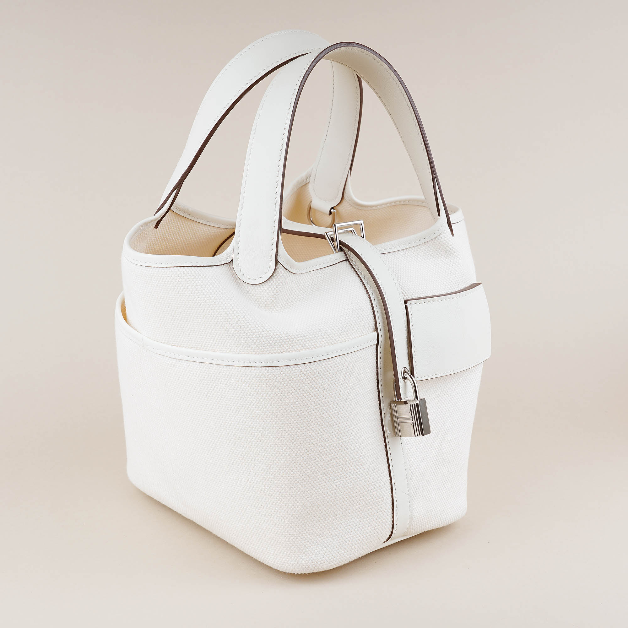 This absolutely stunning bucket bag from Hermès is beautifully made from Toile Goeland Cargo Ecru, Nata Swift leather and palladium hardware. It has contrast stitching, four exterior pockets with two top handles. The interior is lined with Ecru toile canvas and is sure to keep you female essentials in style. The Hermès Picotin Cargo Bag features multiple exterior pockets as well as a pull through closure secured by padlock.