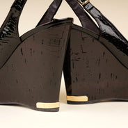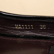 This is a pair of authentic Louis Vuitton Pantheon Wedges in Amarante Monogram Vernis Leather, size 36.